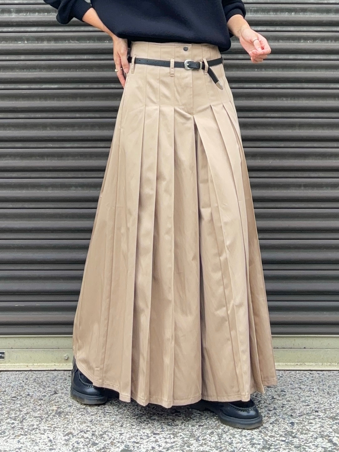 張りのあるしっかりとしたチノ生地で出来たプリーツがとても存在感のあるスーパーワイドパンツです。