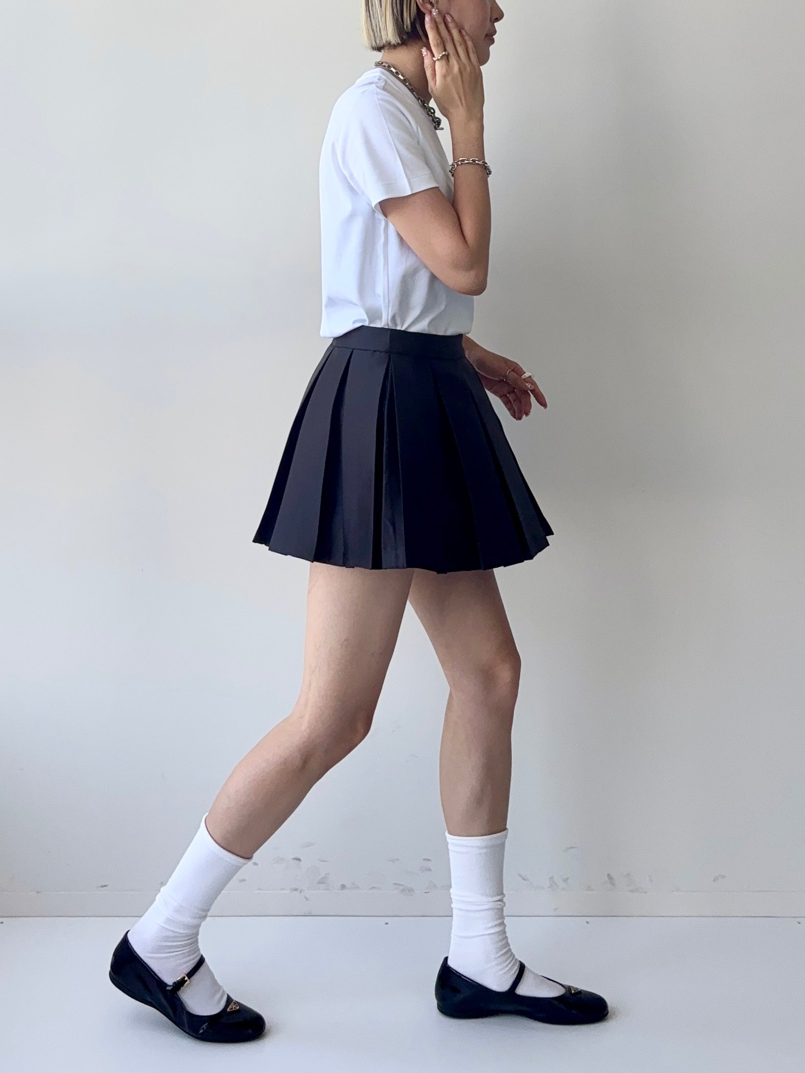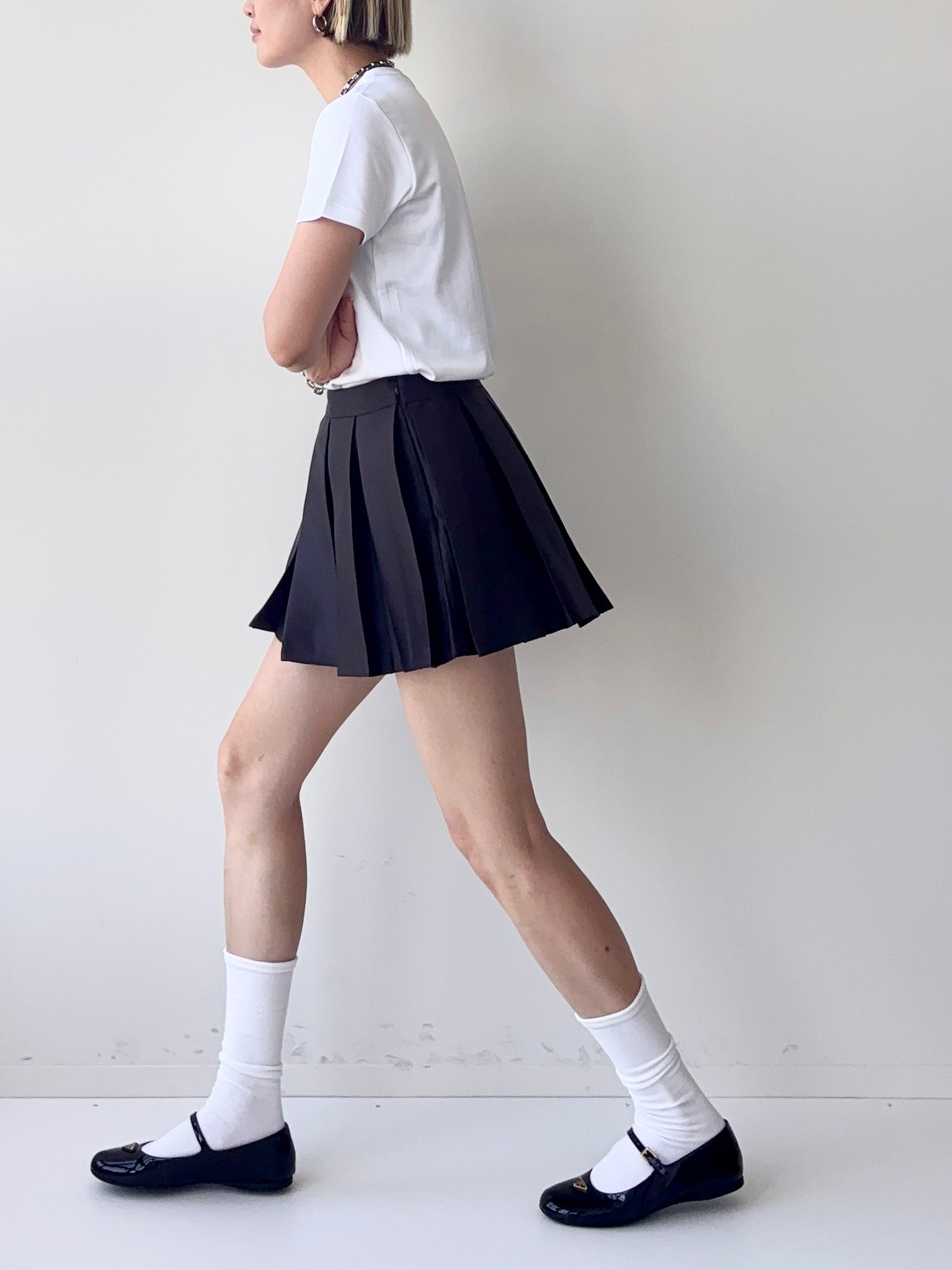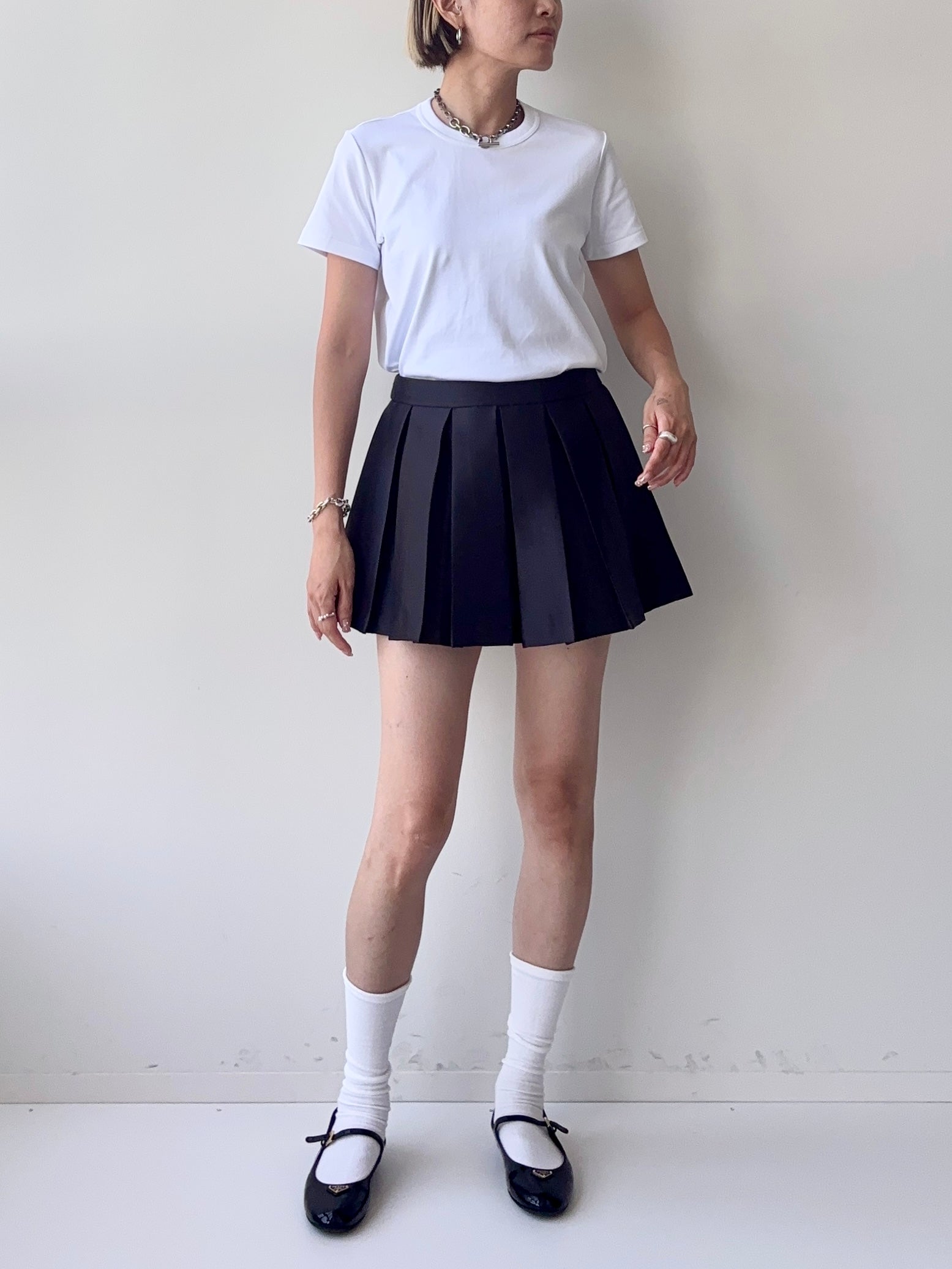 This box pleat skirt features a modern, streamlined look with a flattering compact length that beautifully elongates your legs.