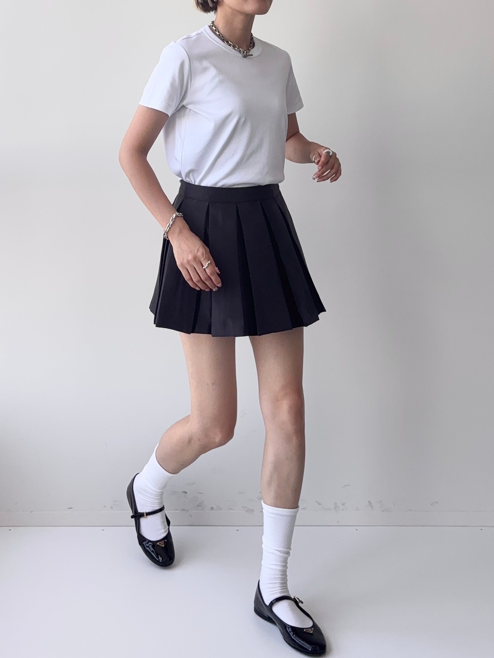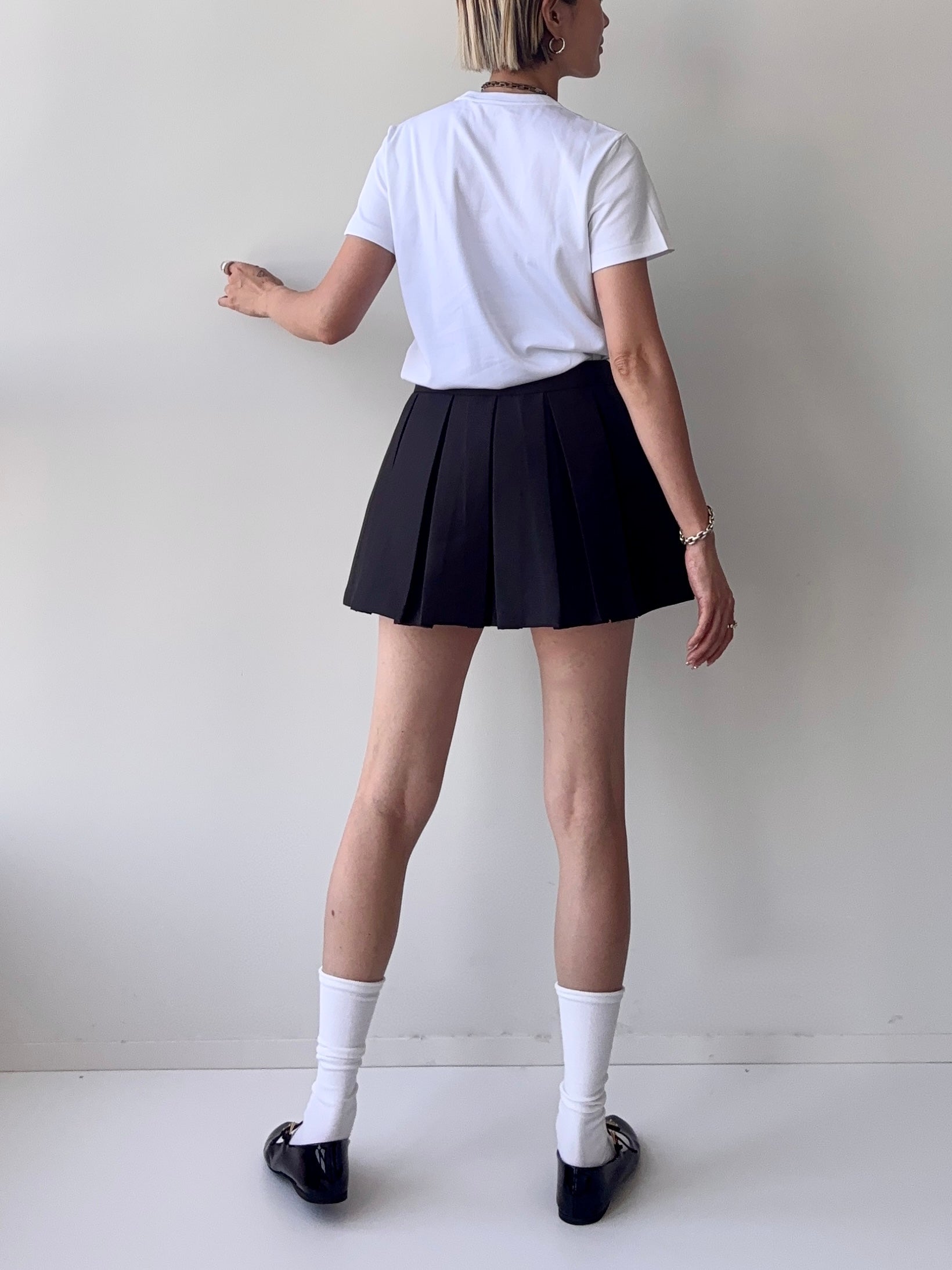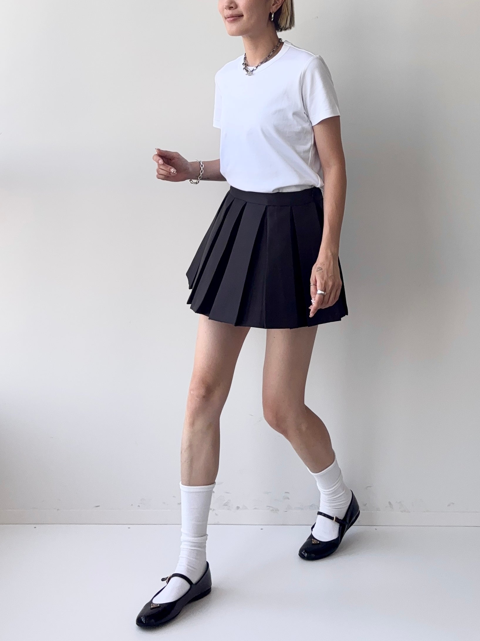 This box pleat skirt features a modern, streamlined look with a flattering compact length that beautifully elongates your legs.