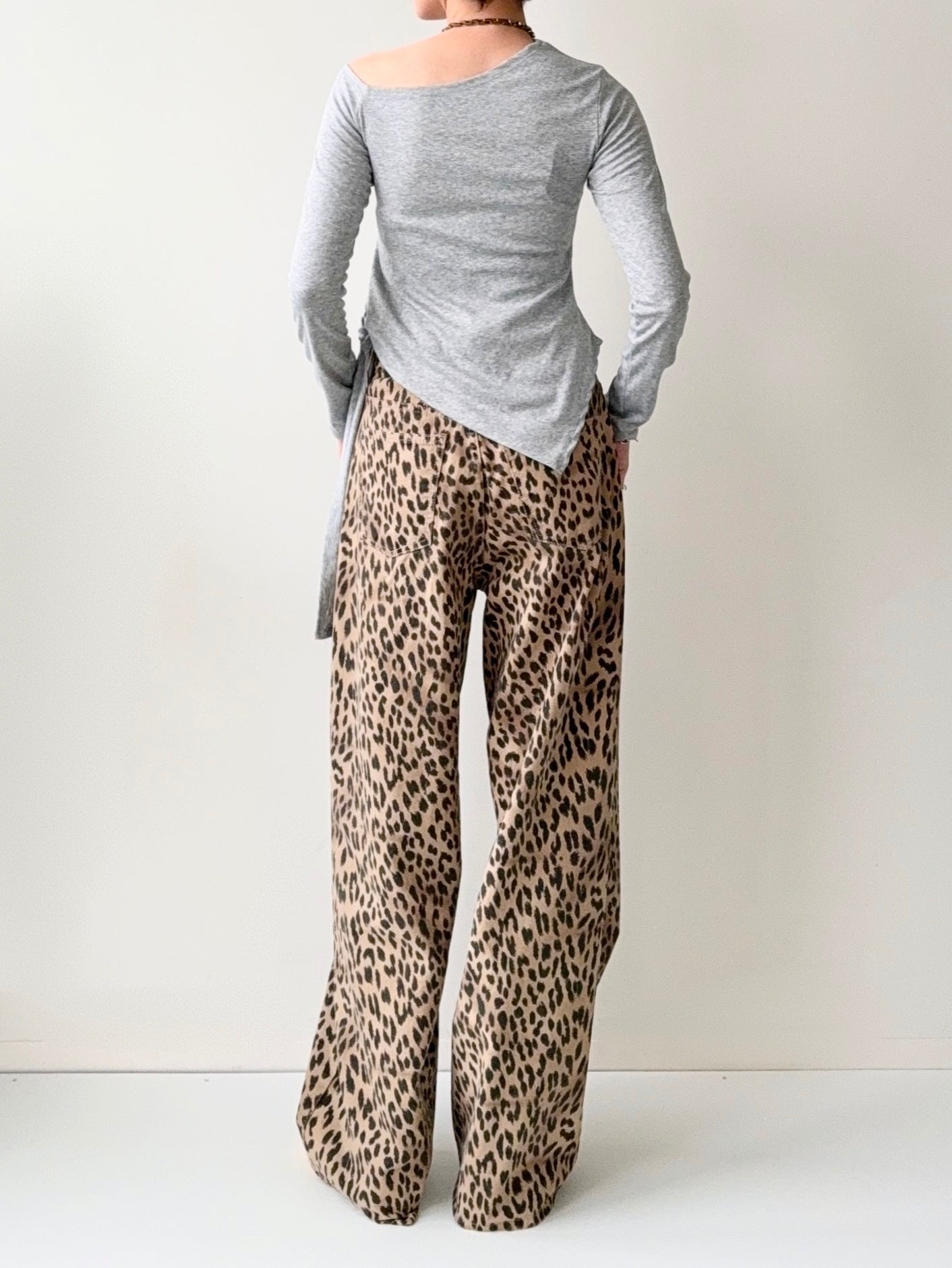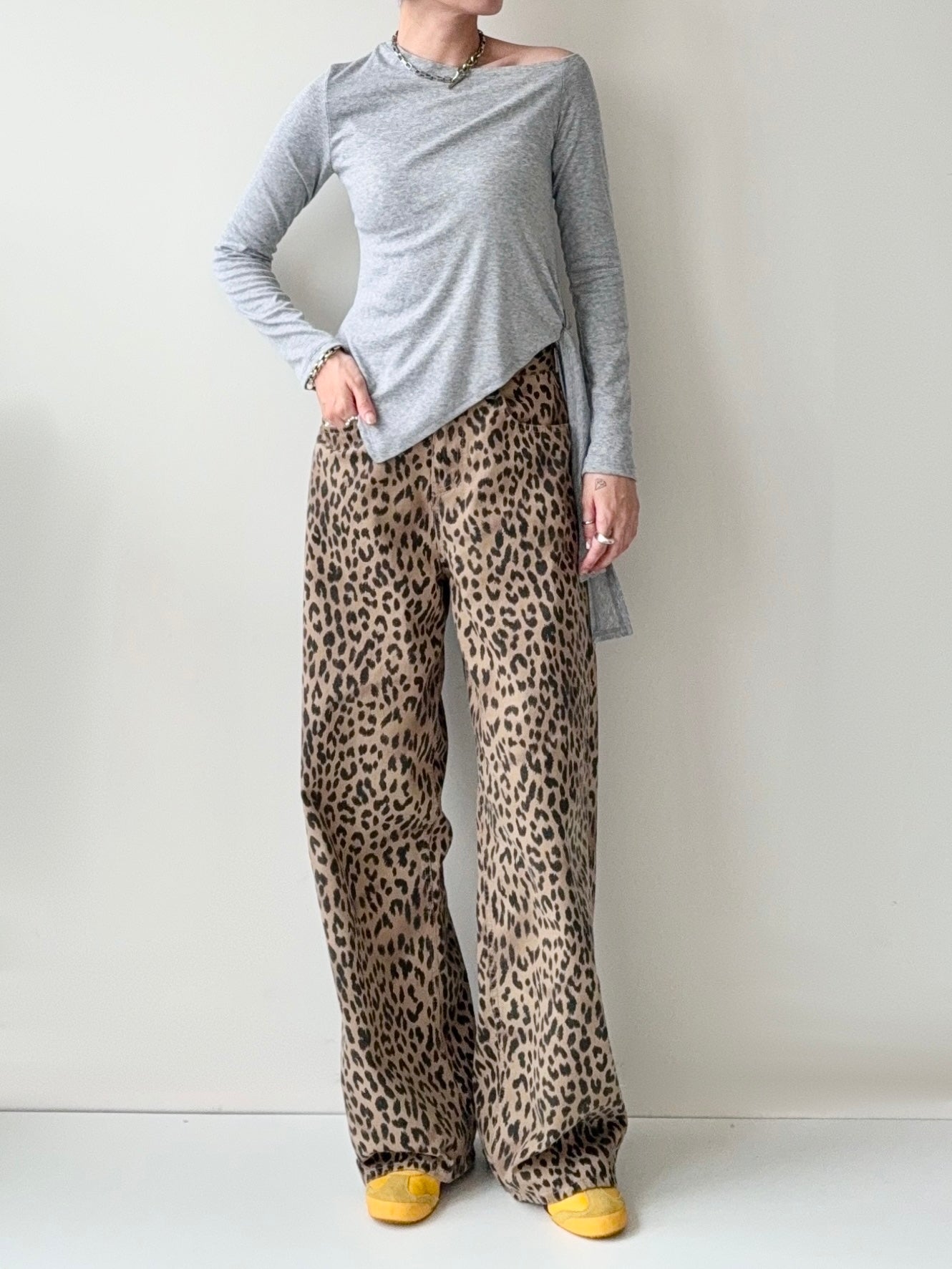 大胆なレオパード柄をモダンに仕上げたパンツ。程いいワイドシルエットが動きにゆとりを与え、リラックス感とモードな雰囲気を両立します。スタイリングはシンプルに白Tシャツを合わせれば抜け感のある大人カジュアルに、ブラックトップスを合わせれば一気にシックでクールな印象に。