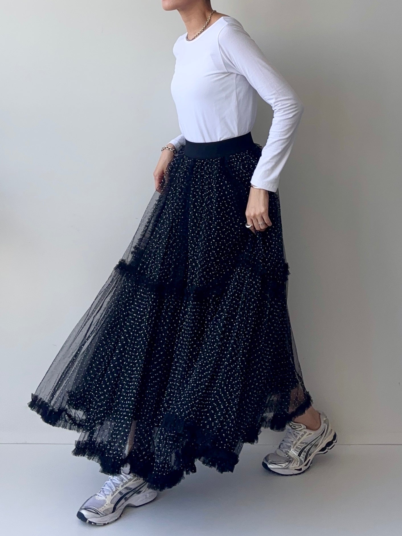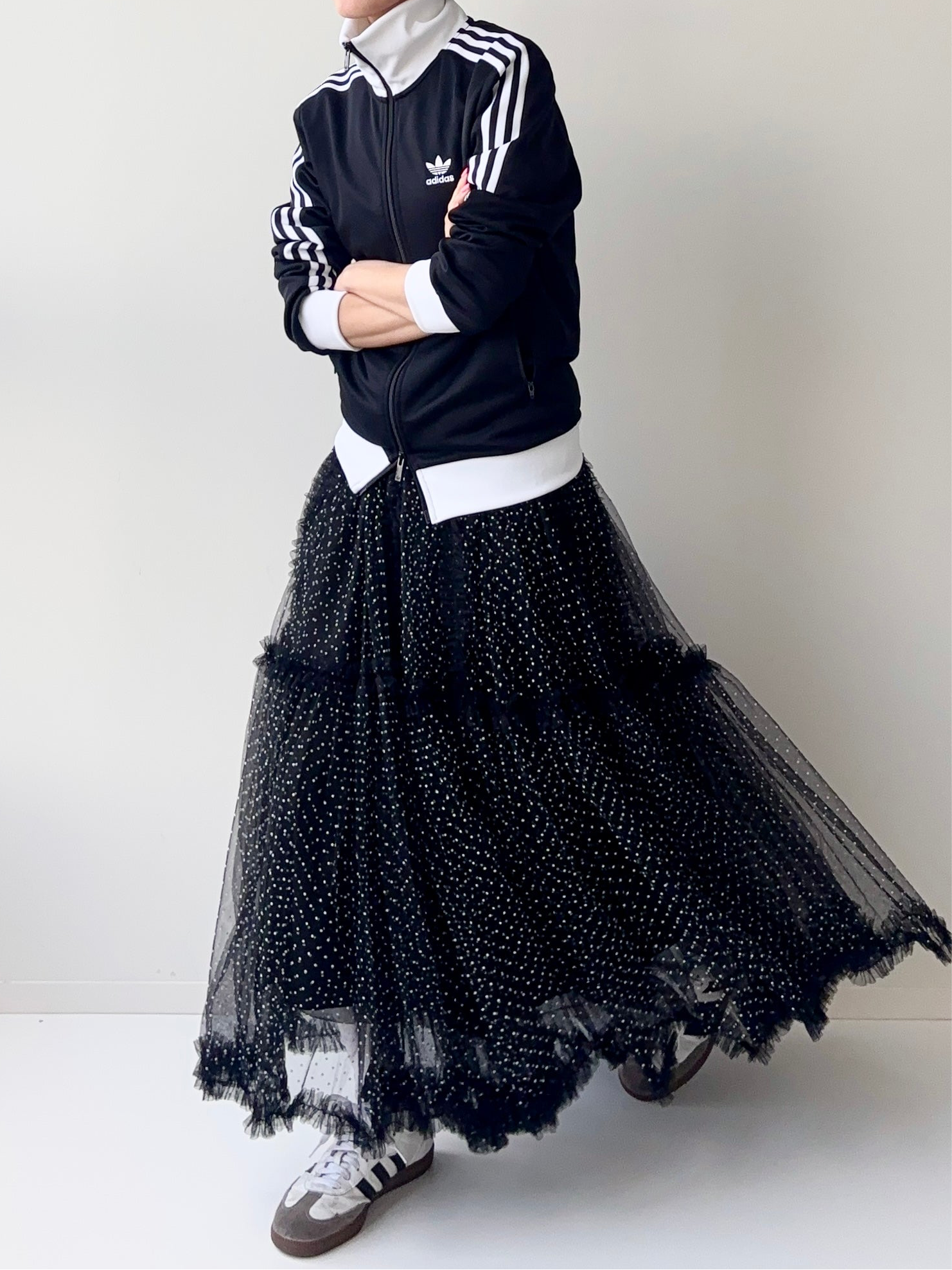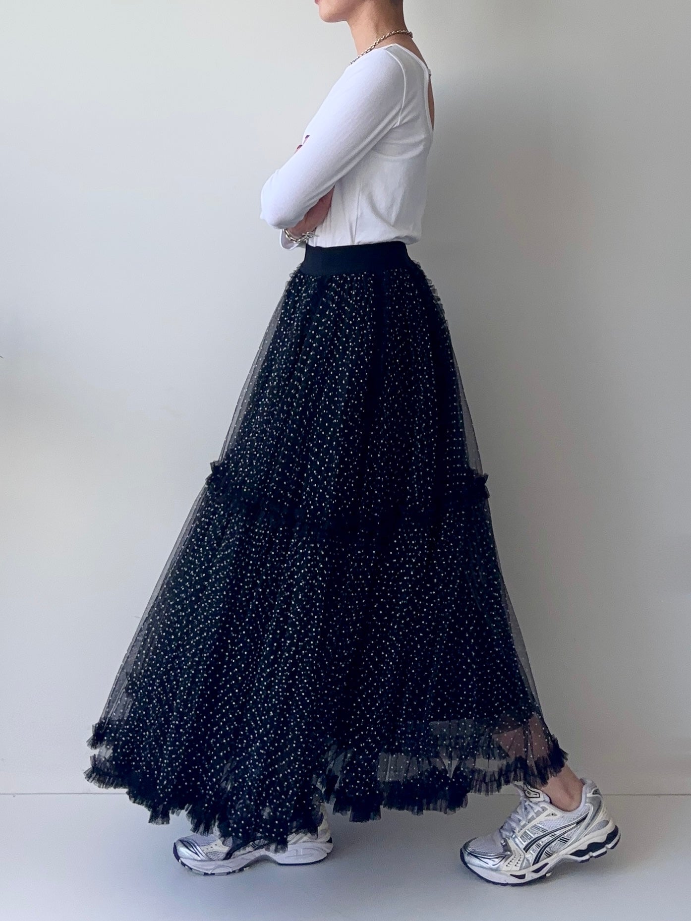 ブラックのチュールについてる小さいドットがとっても上品で、Tシャツやニットと合わせて