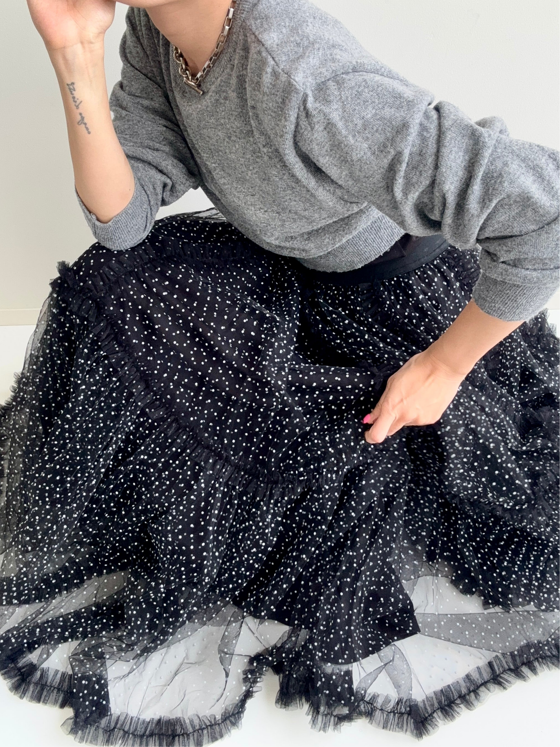 The small dots on the black tulle are very elegant, along with the T-shirt and knitwear